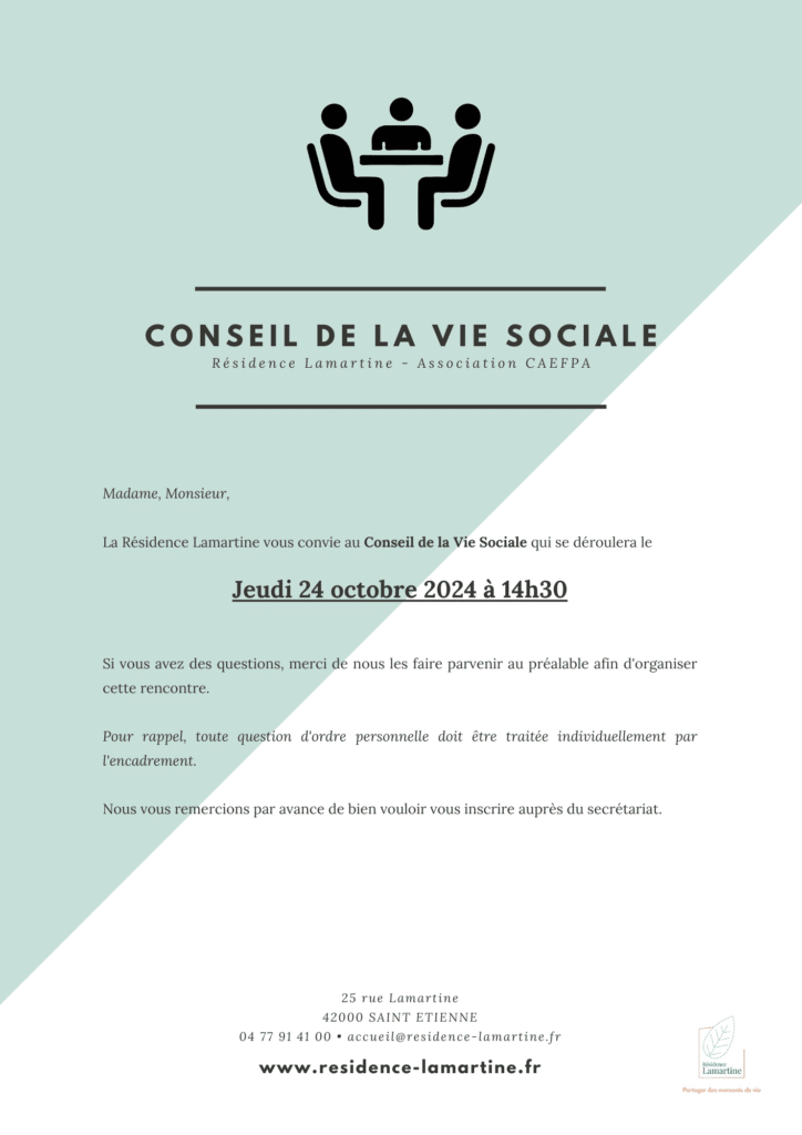 Les résidents et leurs proches sont invités au prochain CVS – Conseil de la Vie Sociale – de la Résidence Lamartine ce jeudi 24 octobre à 14h30.